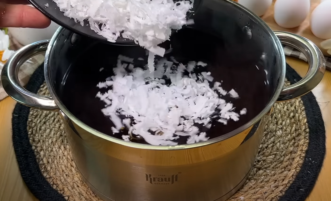 Проціджуємо настій із лушпиння, додаємо 2–3 столові ложки оцту та парафінову стружку. Ретельно перемішуємо, поки парафін не розтане.
