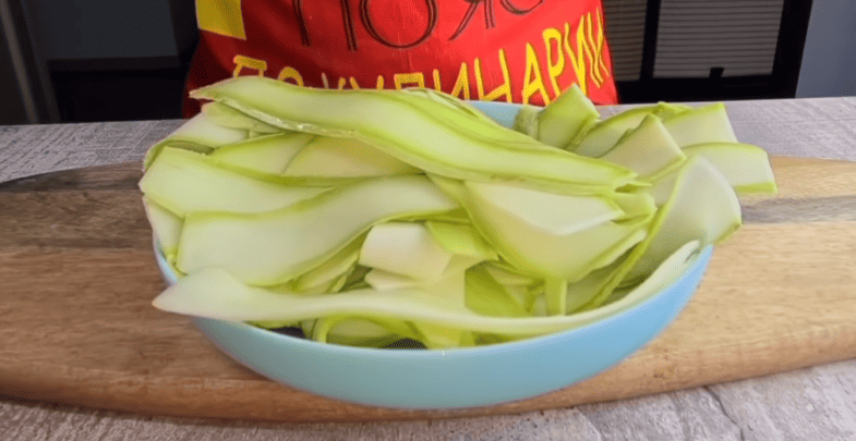 Кабачки промиваємо і за допомогою овочечистки ріжемо на тонкі слайси.