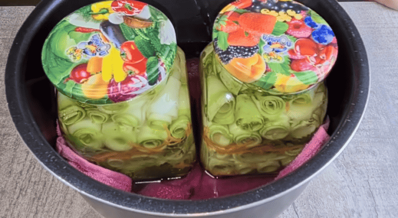Заливаємо маринад у банки, накриваємо кришками та ставимо в каструлю на рушник.