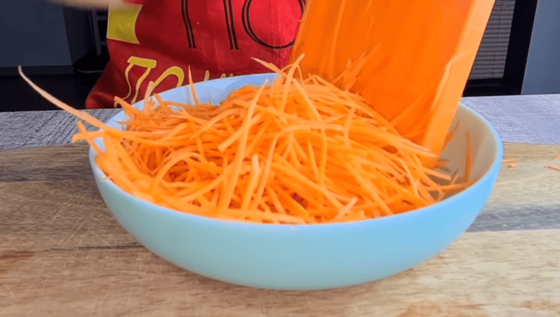 Моркву тремо на великій тертці або на тертці для корейської моркви.