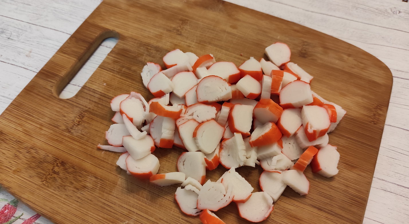 Перекладаємо гриби в миску, щоб остигли. За цей час дрібно нарізаємо крабові палички або натераємо на великій тертці.