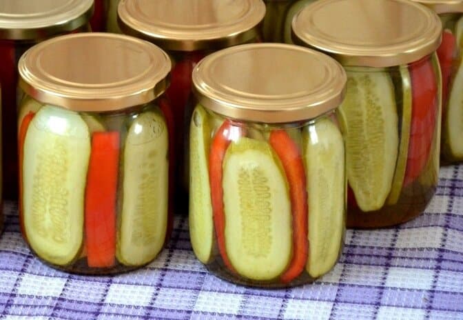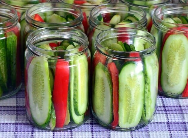 Наповнити банки: закладка проводиться горизонтально – чергуємо пластинки огірка та перцю.
