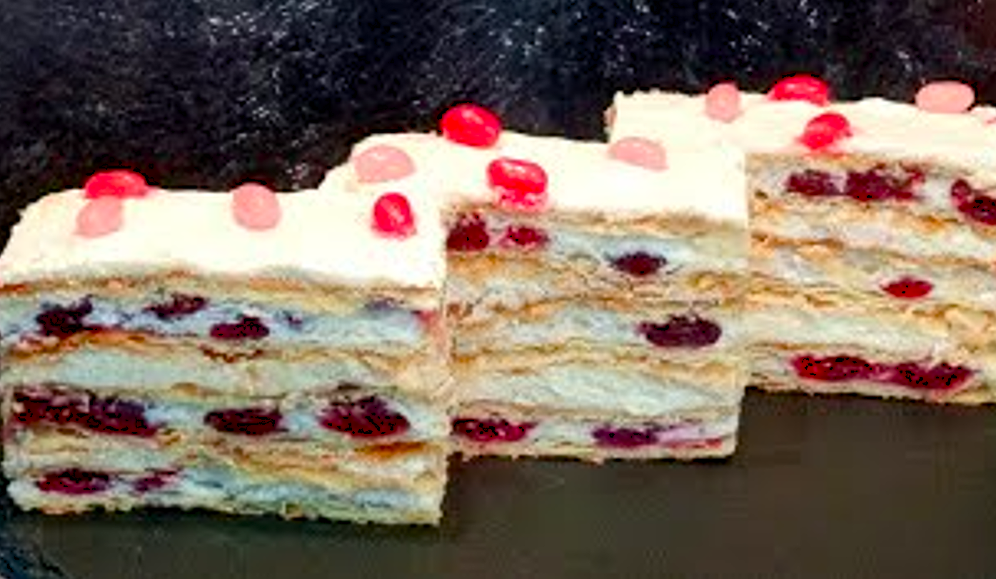 Цей «Наполеон» — справжня знахідка для поціновувачів витонченого смаку. Повітряні коржі, заварний крем, легке білкове суфле та яскрава кислинка вишні створюють ідеальну гармонію. Простий у приготуванні, але з ефектом «вау» на святковому столі!