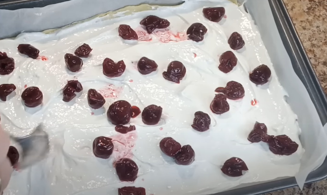 Формування коржів: Тісто розділити на 6 частин. Кожен шар розкачати, викласти білкову масу, додати вишні, накрити другим шаром тіста, зробити проколи. Випікати 15–20 хв. при 200°C.