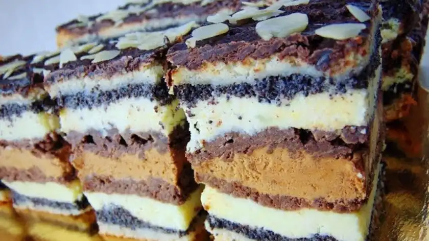 5. Форму вистелити папером. Викласти: шар світлого тіста, сир, мак, терте темне тісто. Випікати при 180°C 35 хв. Охолодити.