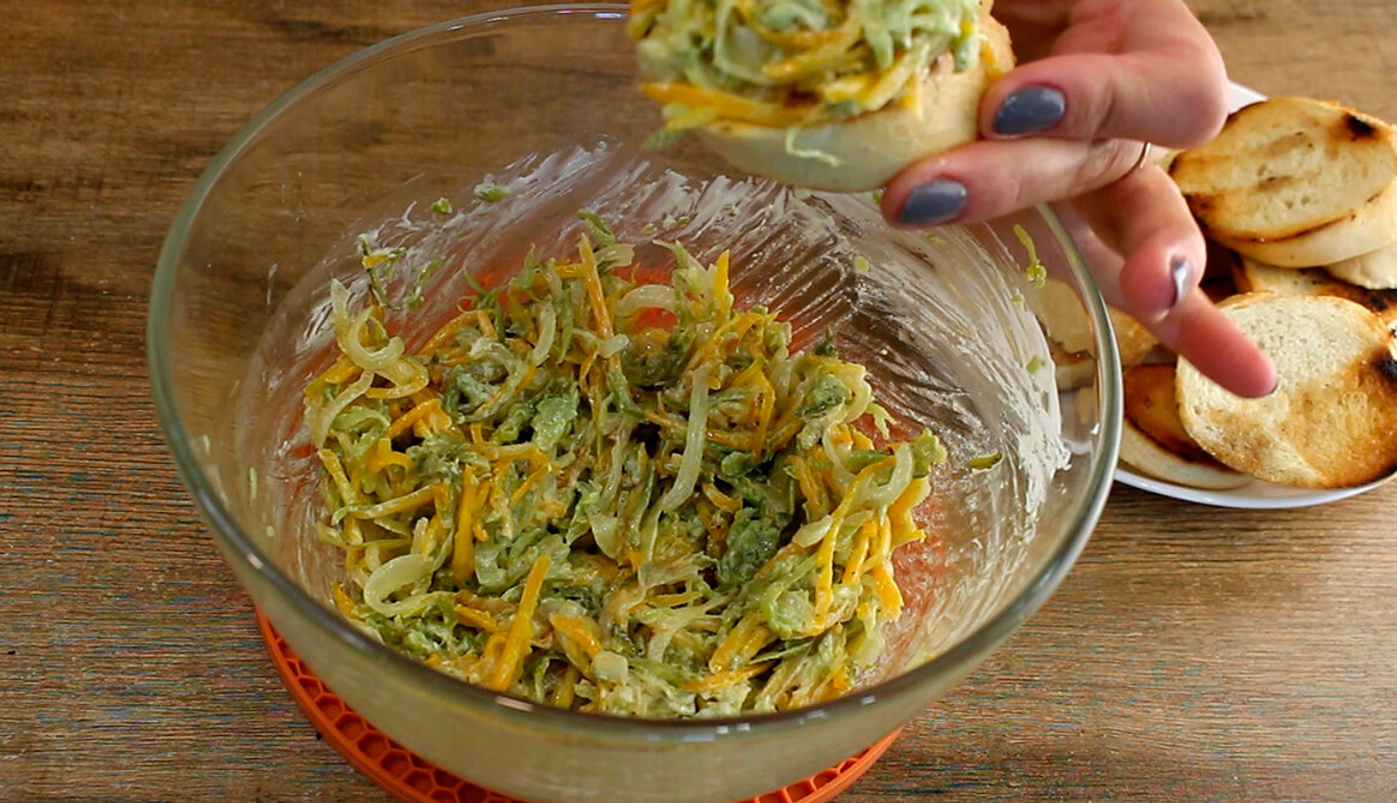 У мисці змішати огірки, обсмажені овочі, подрібнений часник, майонез, сіль та перець.