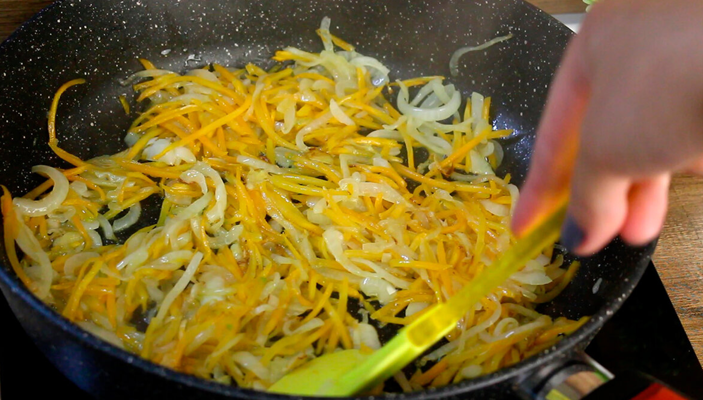Моркву натерти на тертці для корейської моркви. Цибулю нарізати тонкими півкільцями.