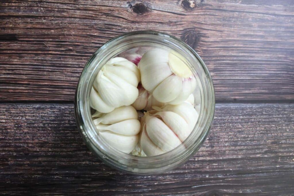 Щільно укладаю часник у стерилізовані банки. За бажанням додаю чорний перець горошком або парасольки кропу — це для аромату та декору, але можна й без цього.