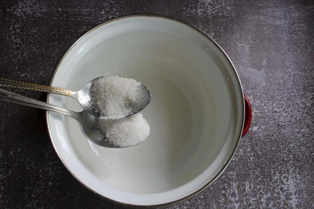 Тим часом готую маринад: у каструлі кип’ячу воду з сіллю та цукром. Коли розчинилось — знімаю з вогню, додаю оцет.
