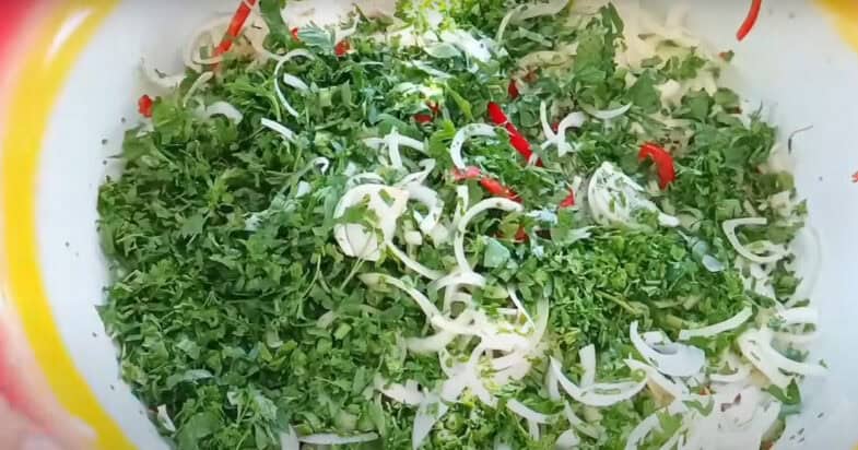 Нарізаю тонко зелень.