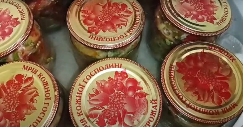 Нарізаний салат накладаю в чисті банки, накриваю кришками і залишаю постояти 1 годину на столі.
