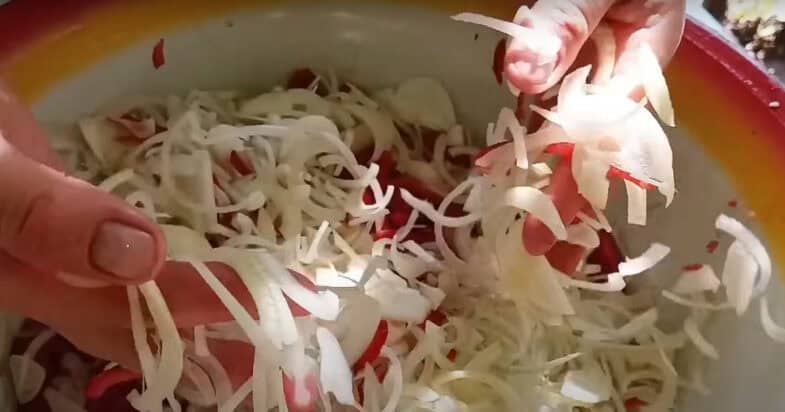 Цибулю нарізаю тонкими півкільцями, кладу до перцю.