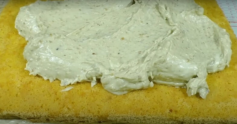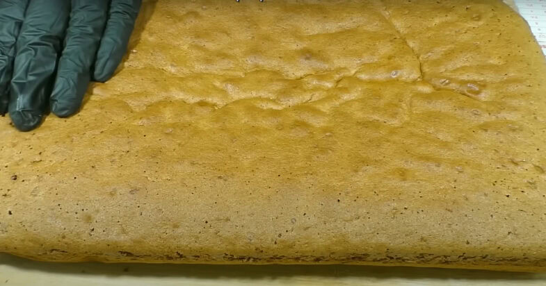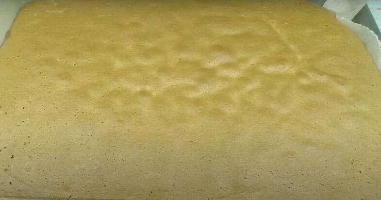 Форму 25 на 35 см застеляю пергаментом і виливаю усе тісто. Відправляю у духовку при температурі 180 градусів на 40 хвилин. Готовий і охолоджений корж завертаю у харчову плівку та кладу у холодильник на декілька годин.