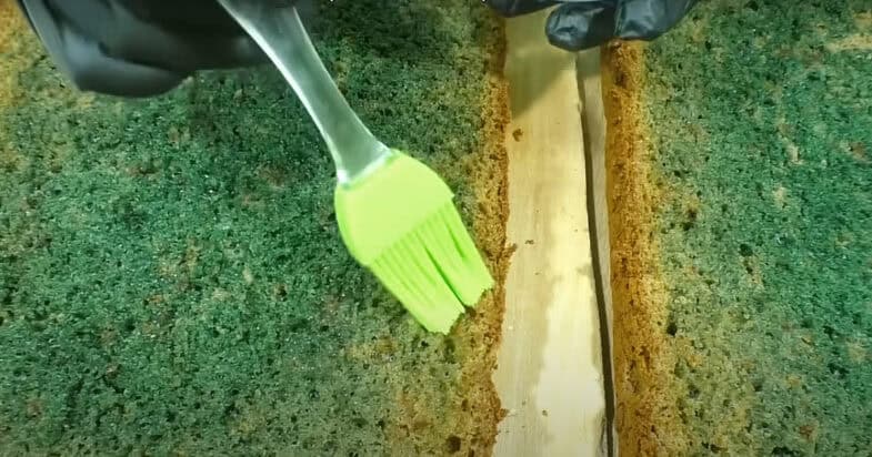 Зелений корж розрізаю навпіл горизонтально. Пропитую сиропом усі три коржі: 2 зелених і 1 жовтий.