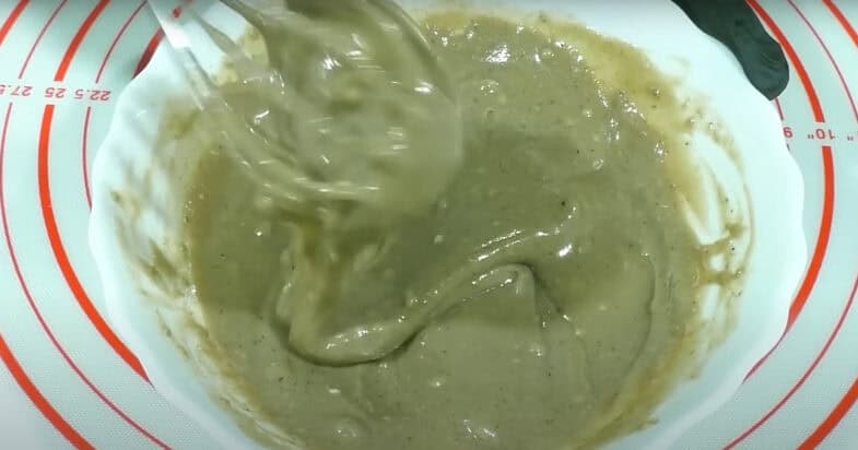 Збиваю яєчні білки міксером в піну. Додаю цукор і збиваю до пишної та світлої маси. Додаю жовтки та збиваю до однорідності. Просіюю борошно, додаю ретельно покришену халву, замішую міксером до однорідності. В кінці додаю соду погашену оцтом, перемішую.