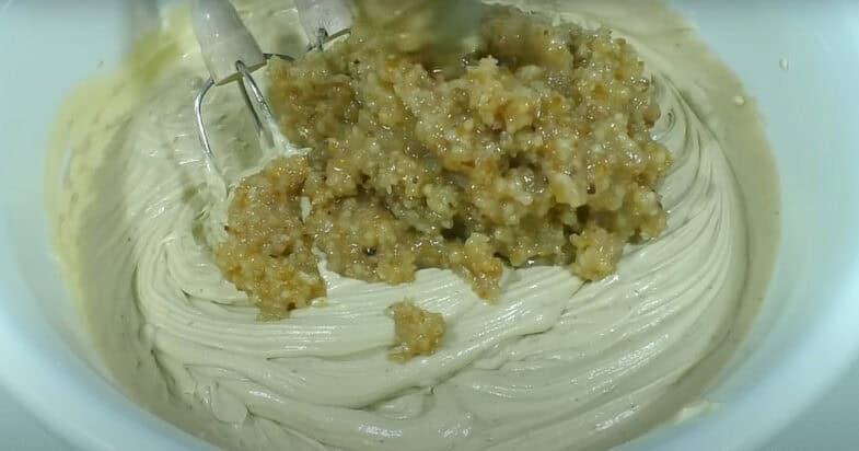 Тепер в окремій мисці збиваю м’яке масло міксером до пишності. По ложці додаю спочатку халвову масу і збиваю до однорідності. Тоді так само поступово додаю арахісову масу і знову замішую міксером до однорідності крему.