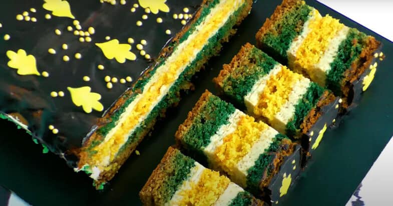 Збираю пляцок: перший зелений корж, крем, жовтий корж, крем, зелений корж.