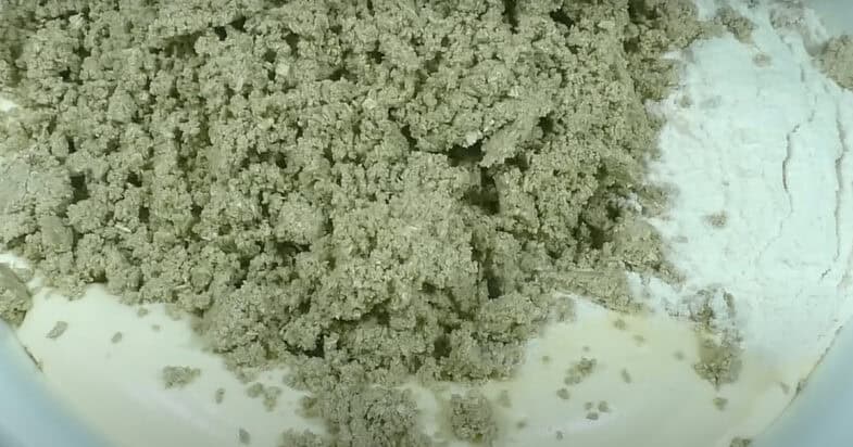 В окремій мисці до покришеної халви вливаю решту гарячого молока і перемішую до однорідності.