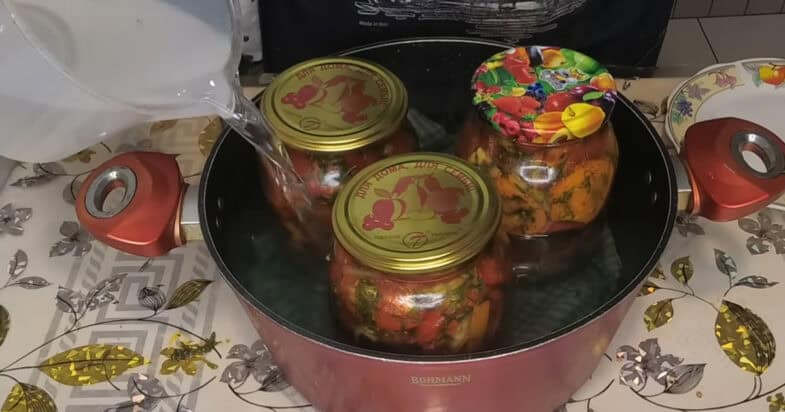 На дно каструлі кладу рушник, ставлю банки та заливаю водою до половини каструлі. Стерилізую на вогні до кип’ятіння води.