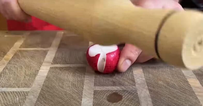 Редиску промиваю, зрізаю хвостики, відбиваю зверху, він обов’язково має тріснути.