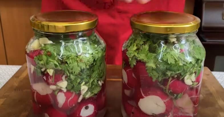 Викладаю редиску у банки, нарізаю дуже дрібно часник, солю, додаю перці горошком. Вливаю чи видавлюю лимонний сік. Додаю зелень петрушки та зелень кінзи. Заливаю водою, закриваю щільно кришками. Добре збовтую банки у руках. Відправляю в холодильник мінімум на 1 годину.