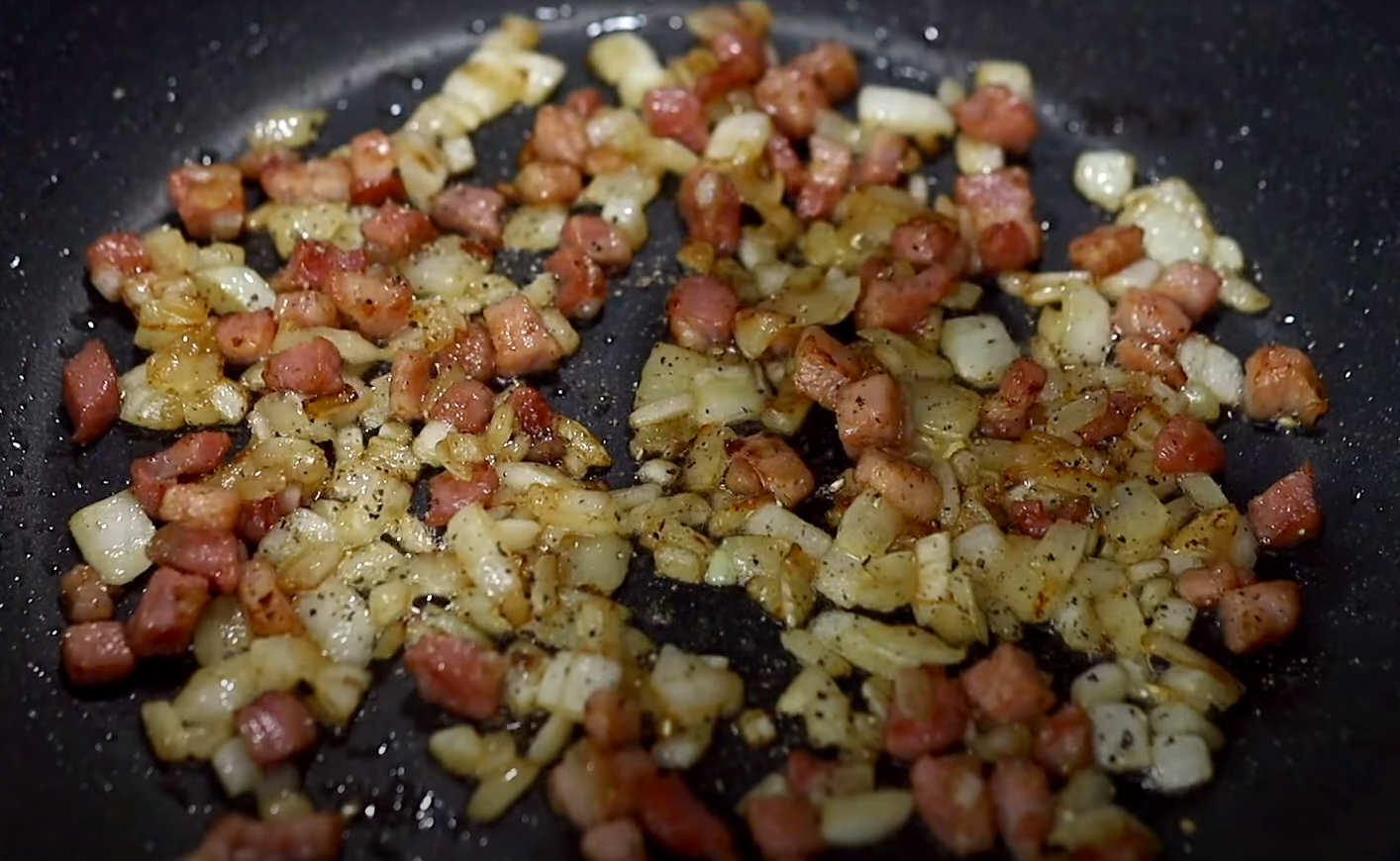 На сковороді обсмажте бекон (нарізаний кубиками), додайте дрібно нарізану цибулю. Підрум’яньте до золотистого кольору, поперчіть.
