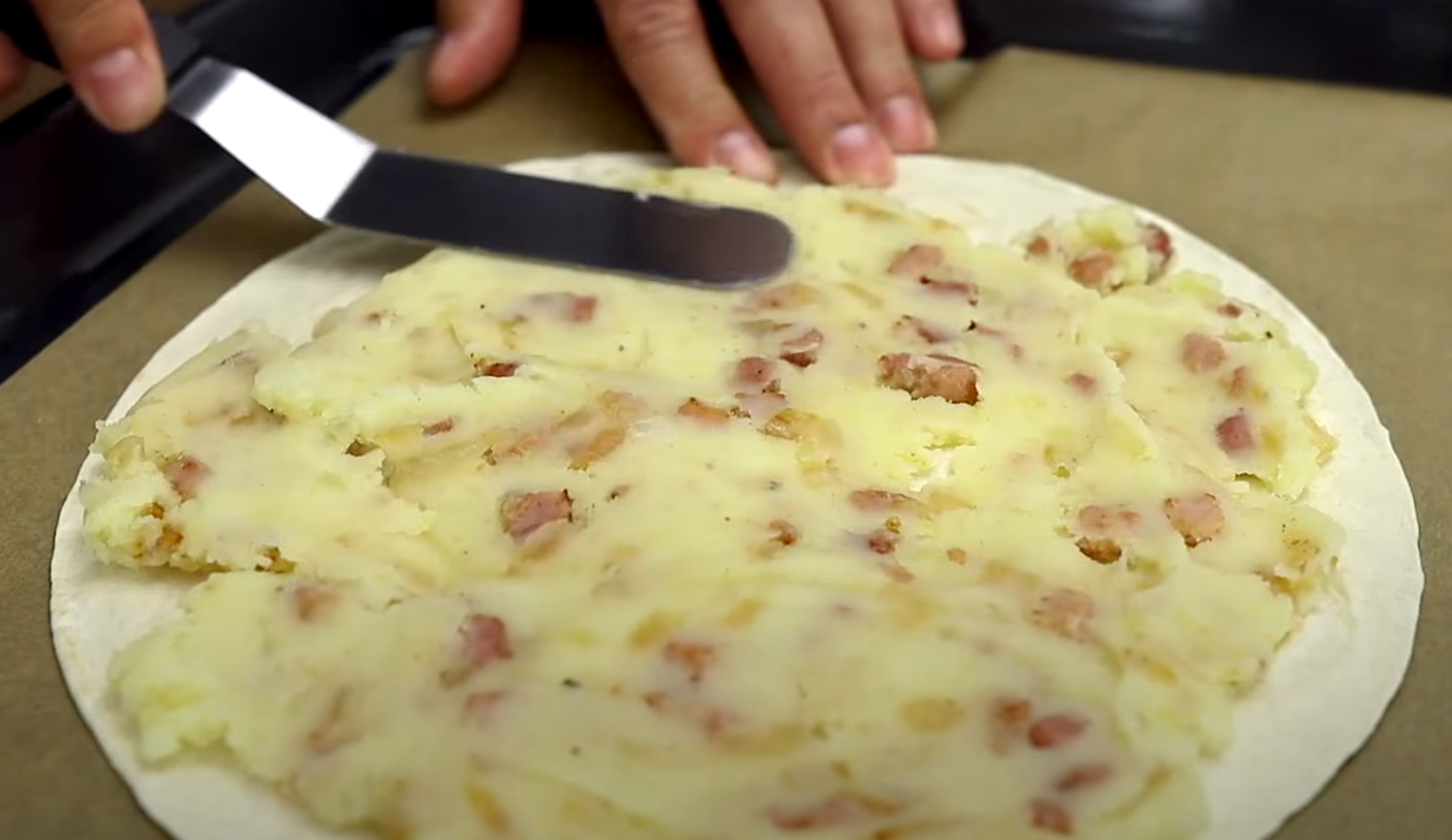 Викладіть лист п’ядіни (або лаваша) на форму з пергаментом, розподіліть картопляну начинку.