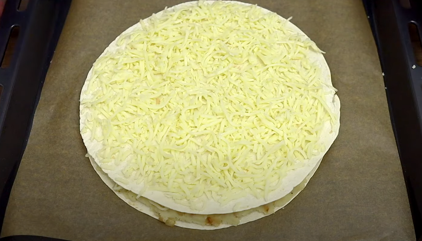 Зверху присипте натертою моцарелою, накрийте другим листом п’ядіни й знову посипте сиром.