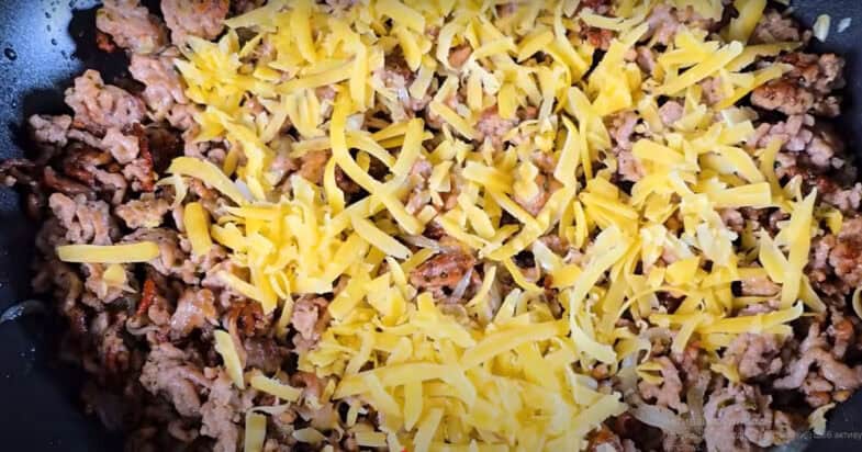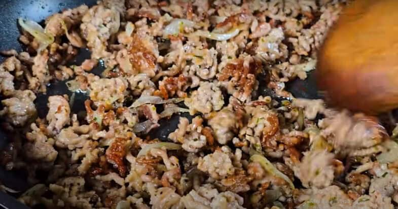На сковорідці розігріваю олію та обсмажую до готовності фарш. Додаю дрібно порізану цибулю, обсмажую, помішуючи, до м’якості цибулі, солю та перчу, всипаю сушений часник, петрушку та орегано.