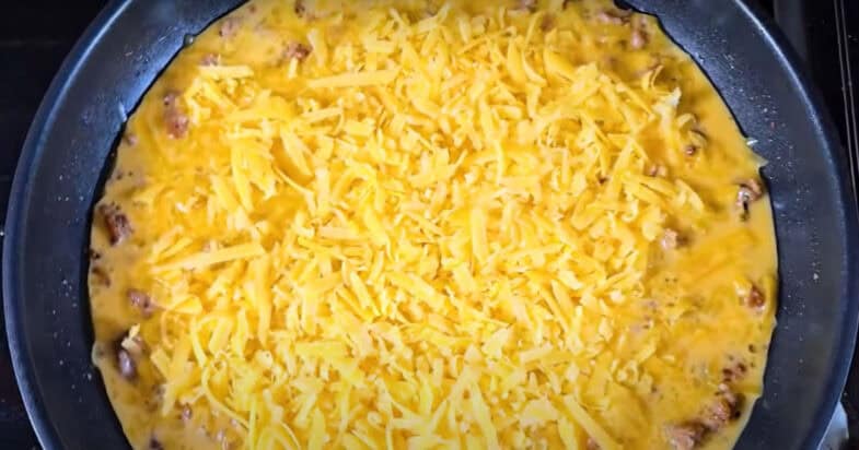 Змішую для заливки яйця з вершками, вливаю у сковорідку, посипаю зверху ще тертим сиром. Ставлю в духовку й запікаю впродовж 20 хвилин за температури 175 градусів.