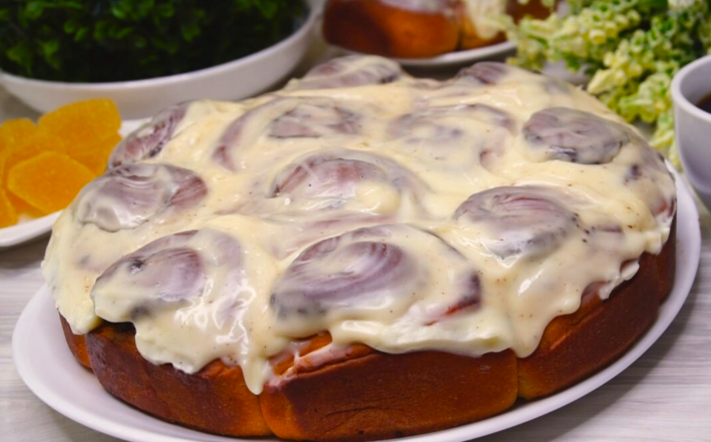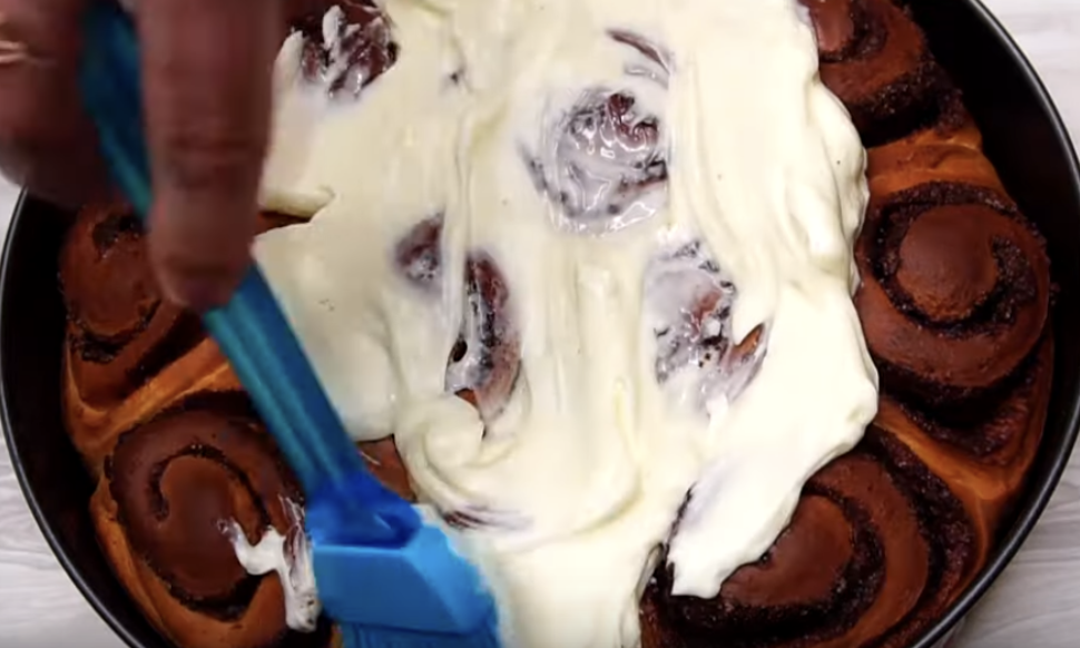 8. Щойно пиріг спечеться — змастіть гарячий вершковим кремом і залиште до повного охолодження.