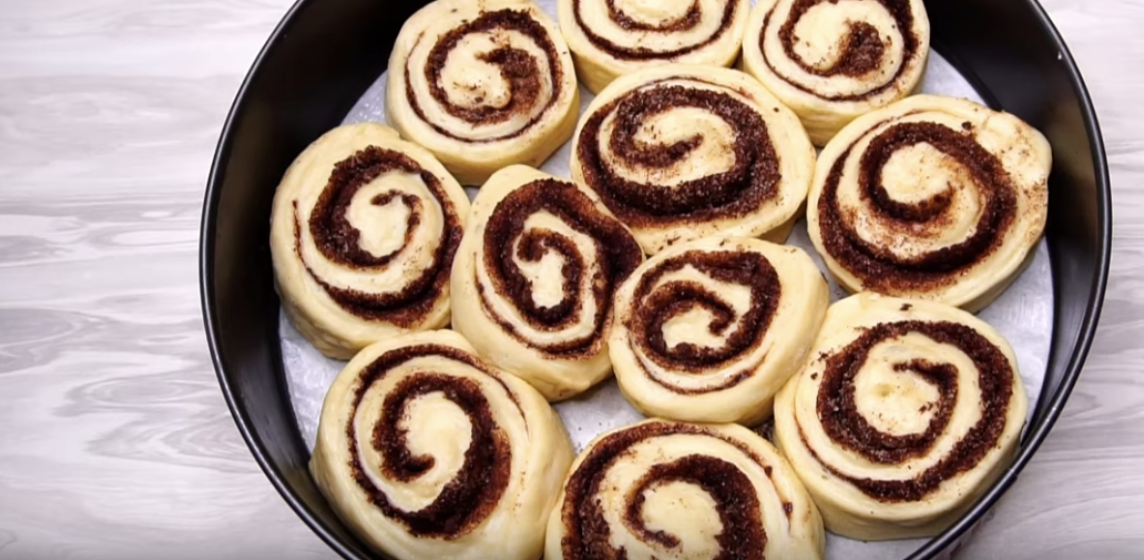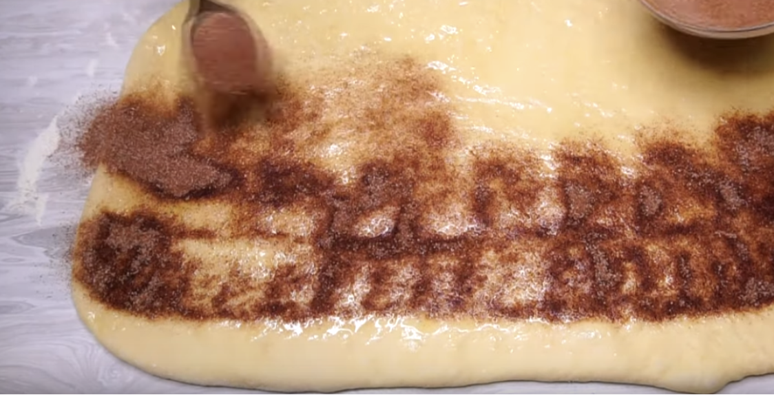5. Розкачайте тісто, змастіть розтопленим маслом, посипте начинкою, скрутіть у рулет, наріжте кружальцями.
