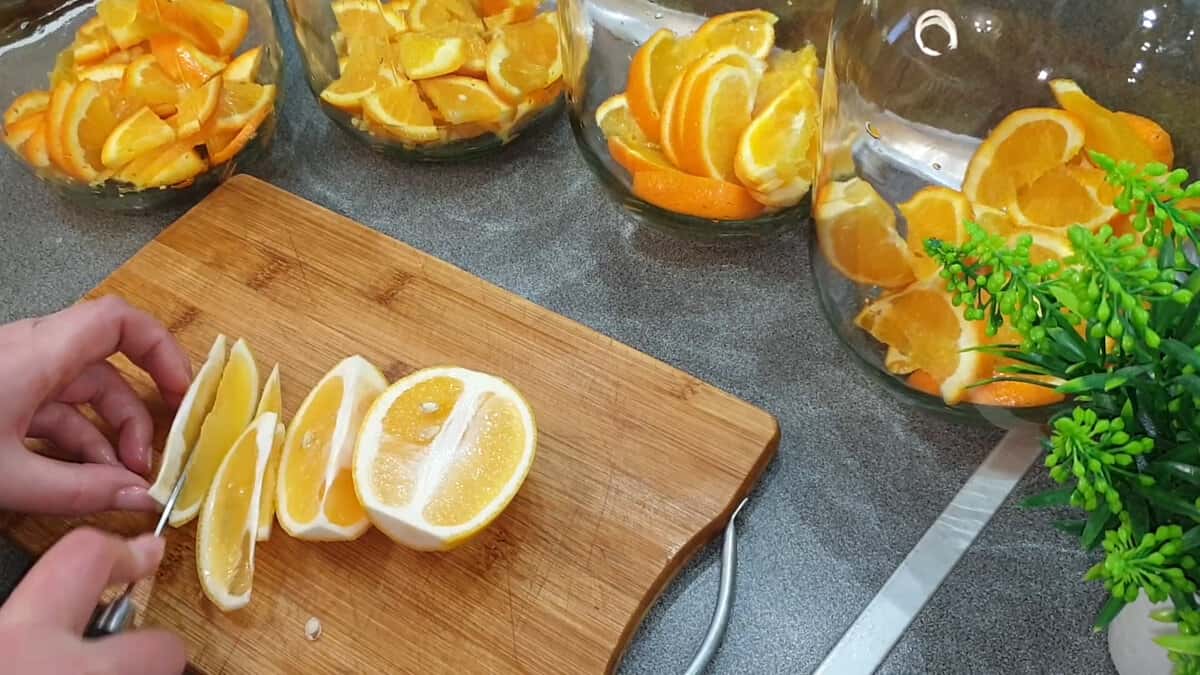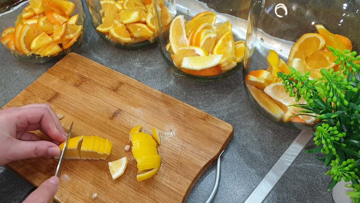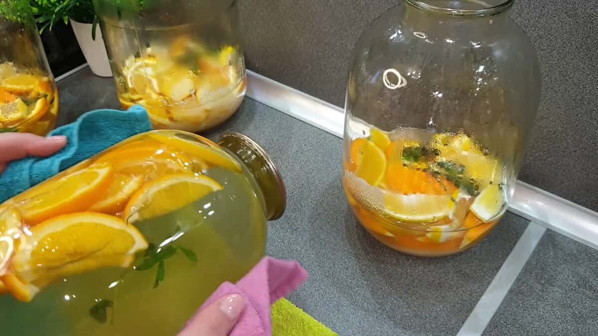 Цей цитрусово-м’ятний напій подобається і дорослим, і дітям. При бажанні можна додати трохи грейпфрута (без шкірки). Зберігати такі банки можна як у погребі, так і в коморі — взимку буде нагода відчути яскравий смак літа!