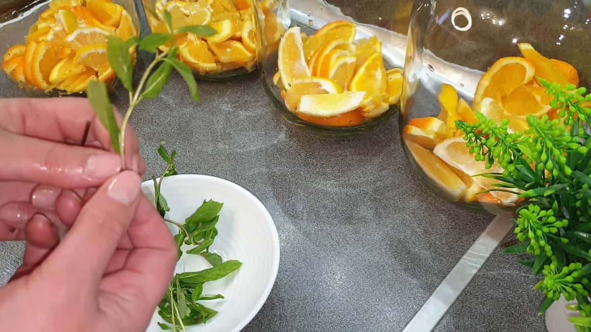 4. У чисту, добре вимиту банку (без стерилізації) кладу нарізані цитруси та кілька листочків м’яти. Якщо м’ята запашна — вистачить зовсім трішки. Для виразнішого м’ятного смаку покладіть більше.