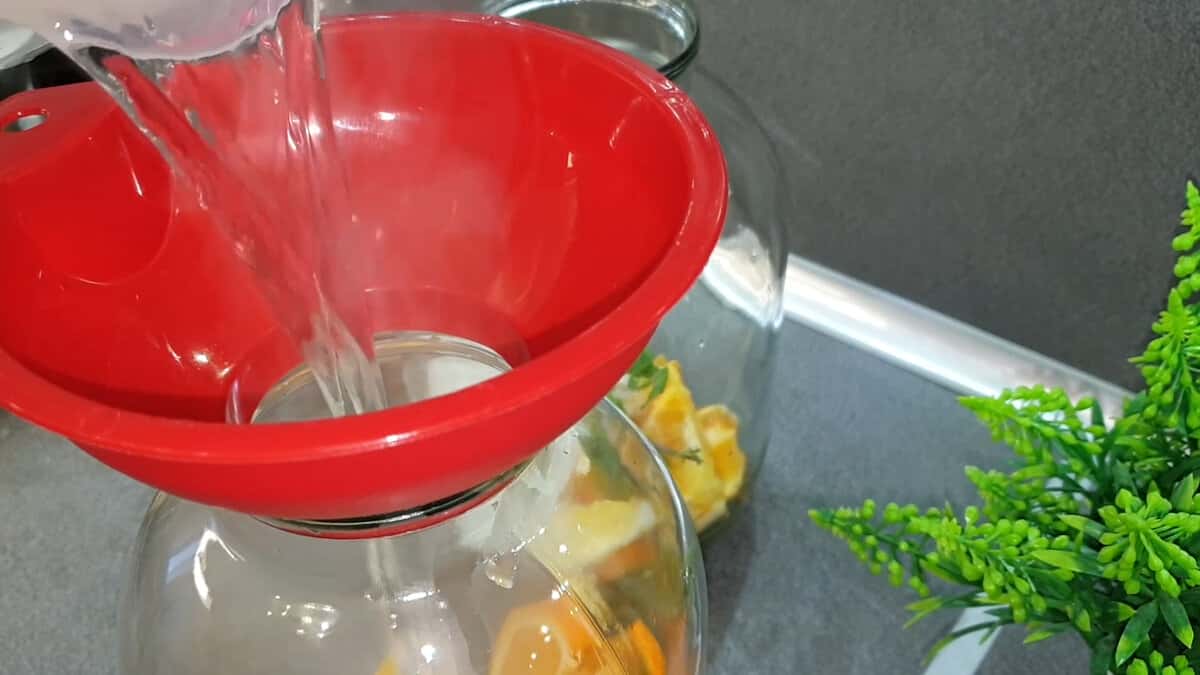 6. У банку з фруктами насипаю цукор (300 г) і обережно заливаю кип’ятком: спочатку невелику кількість (щоб банка не луснула), через пів хвилини – доливаю доверху.