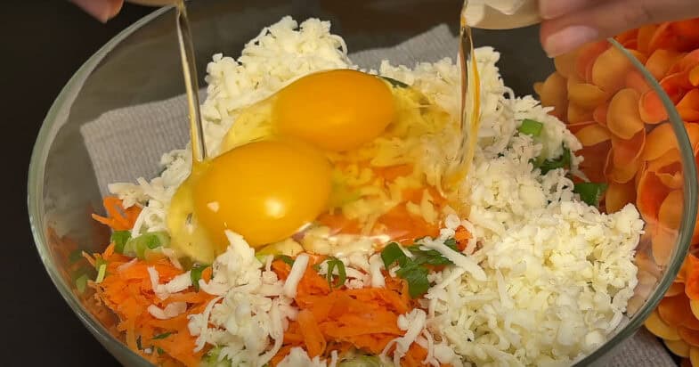 Кабачок натираю на терці, віджимаю зайву рідину через сито.  Кладу у глибоку миску, сюди ж натираю на терці картоплю та моркву. Зелену цибулю нарізаю дрібно. Сир натираю на терці, додаю яйця, сіль, перець мелений чорний, часник сушений, солодку паприку, борошно, перемішую до однорідності.