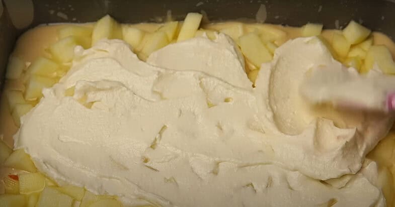 Форму 28 на 18 см застеляю пергаментом, змащую олією і викладаю більшу частину тіста. Яблука очищаю, нарізаю шматочками, змішую з лимонним соком, кладу на тісто. Зверху викладаю сирну начинку.
