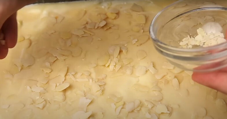 Докладаю решту тіста і посипаю мигдалевими пелюстками. Випікаю у розігрітій духовці до 180 градусів приблизно 50 хвилин.