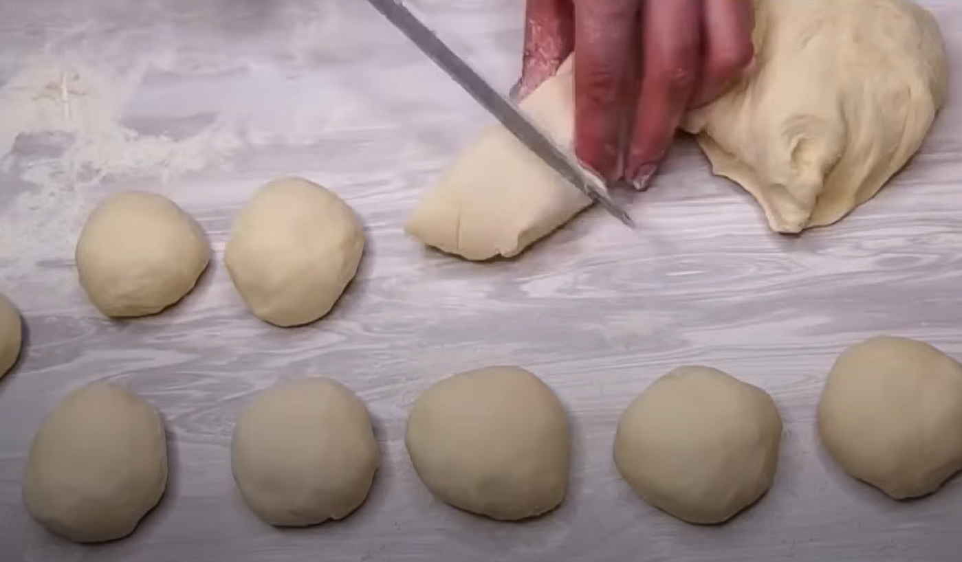 Тісто одразу готове до роботи. Ділимо на шматочки по 50–60 г, формуємо кульки