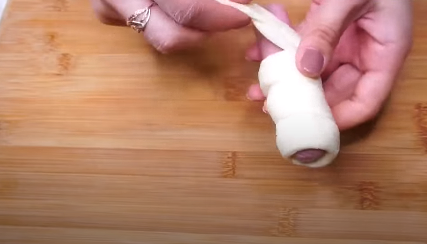 Для сосисок: розкачуємо кульку в джгут і обмотуємо навколо сосиски