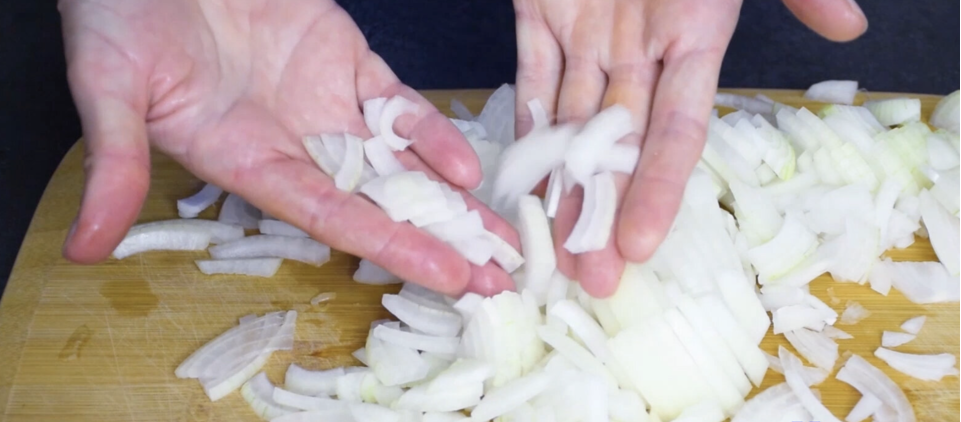 🔹 Починаємо з цибулі. Нарізаємо її півкільцями або кубиками — як вам зручніше — і обсмажуємо в розігрітій олії на середньому вогні, періодично помішуючи, приблизно 10 хвилин.