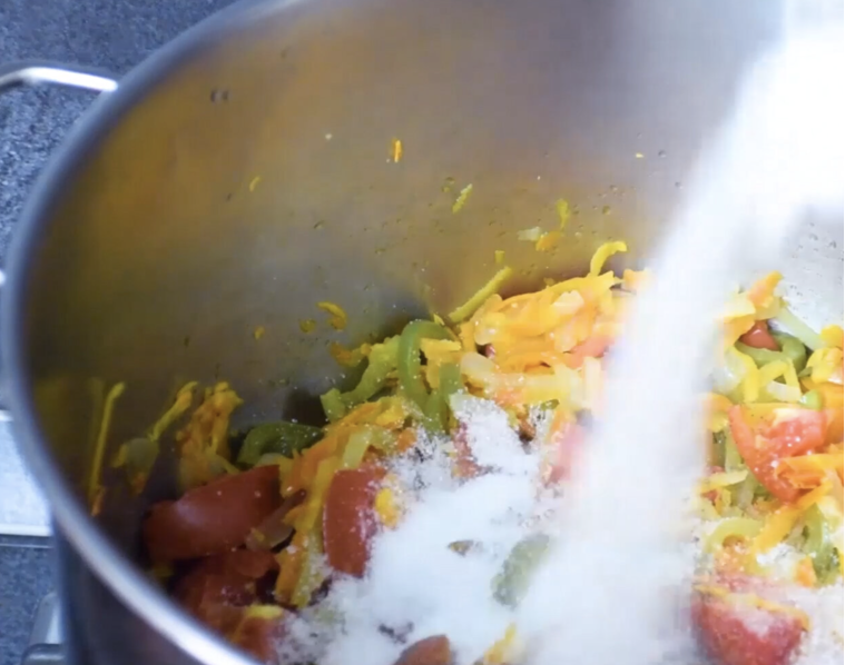 🔹 Час для спецій. Додаємо сіль, цукор, чорний мелений перець і томатну пасту. Перемішуємо.