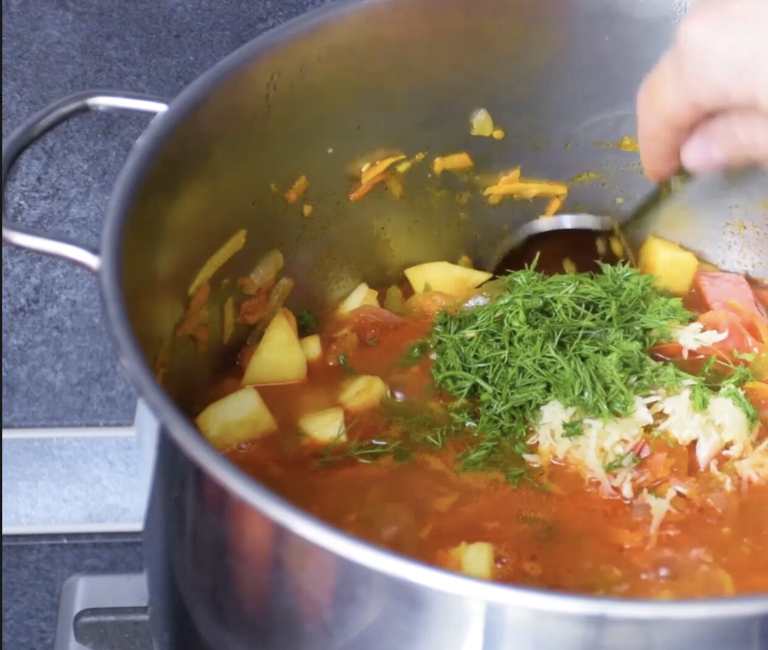 🔹 Завершальні штрихи. Додаємо подрібнений часник (через прес або дрібну тертку) та свіжий кріп, дрібно нарізаний ножем.