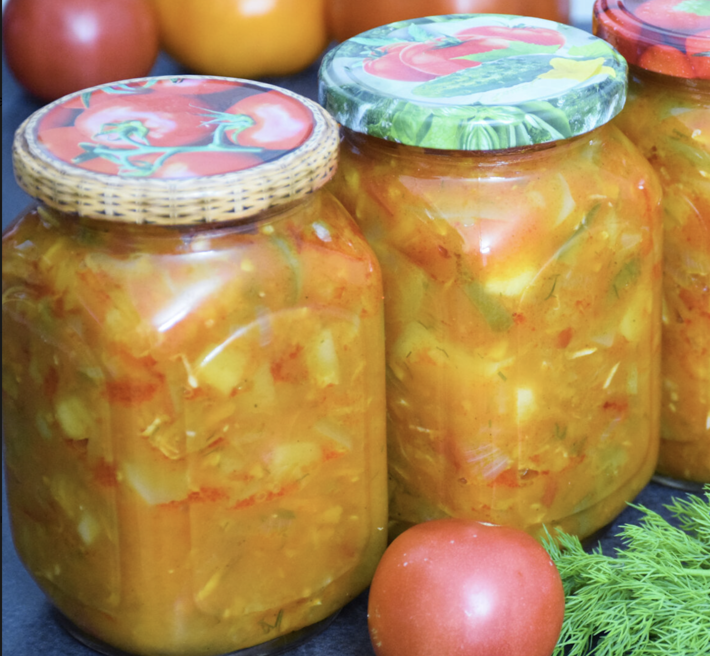 Розкладаємо гарячу закуску в підготовлені банки, закручуємо, перевертаємо догори дном і вкутуємо в тепле. Після повного охолодження переносимо в прохолодне місце для зберігання