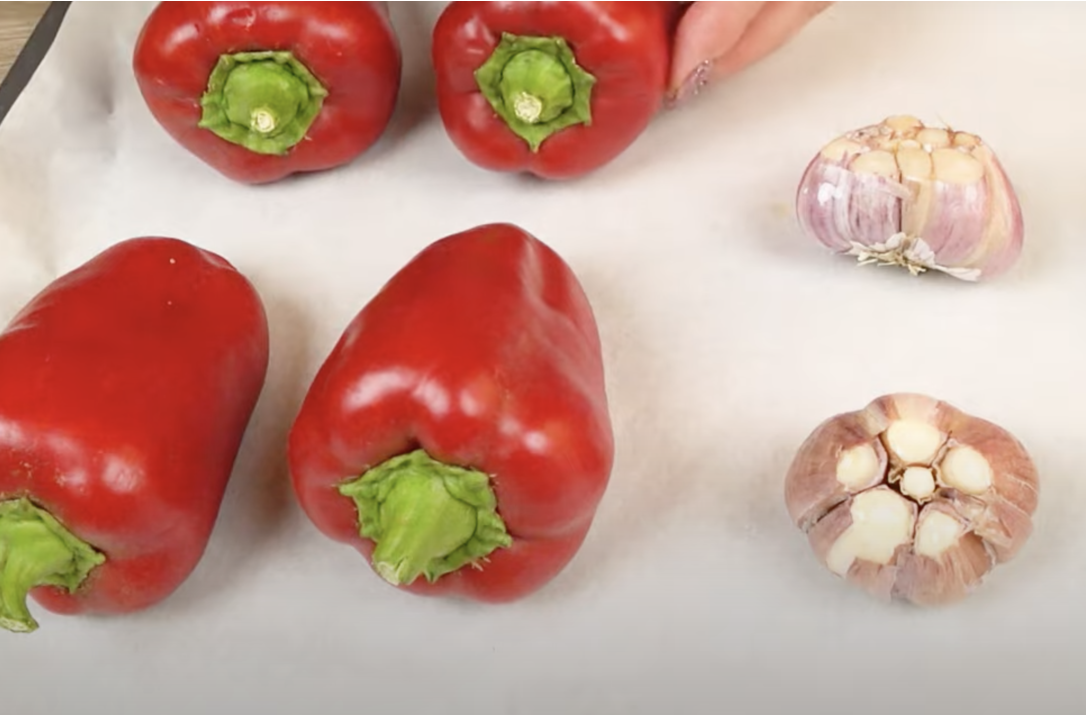 Не розділяючи часник на зубчики, трохи очистіть його від лушпиння та зріжте верхівки. Перекладіть на деко з пергаментом і змастіть олією. Поруч покладіть перці