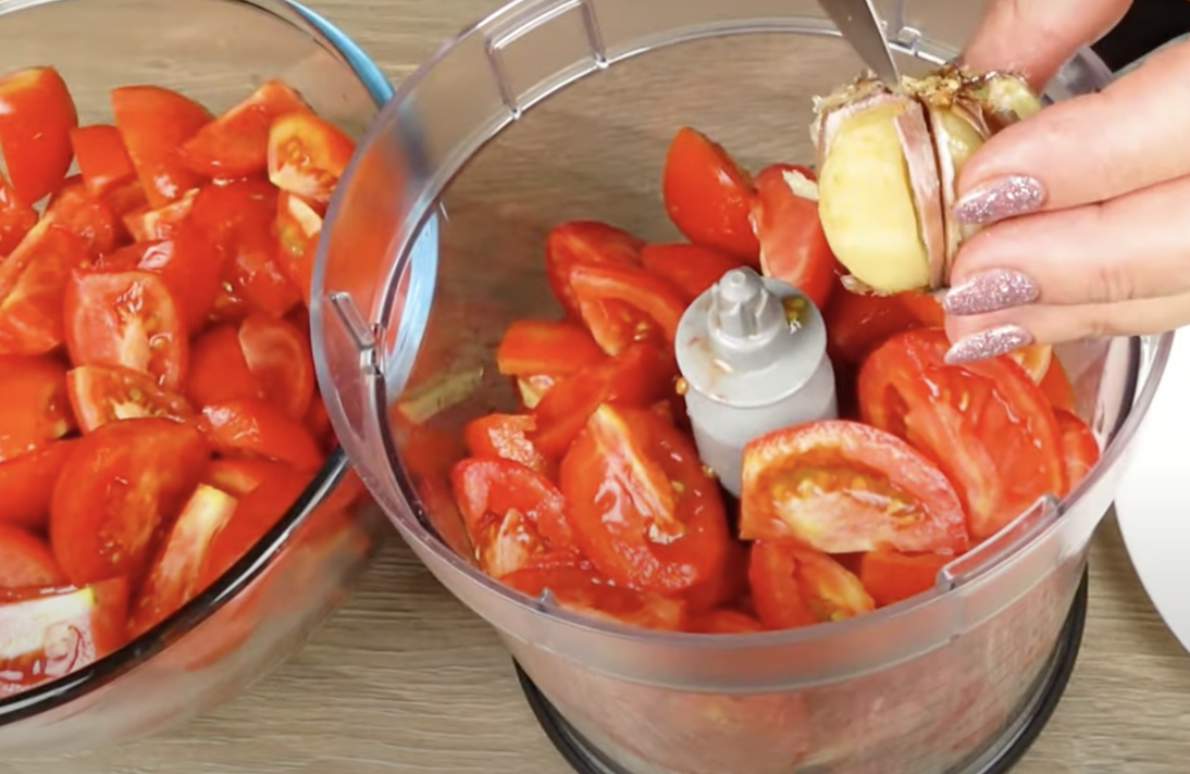 Гарячі перці помістіть у миску та накрийте – так шкірку буде легше зняти. Часник остудіть, очистіть і збийте в блендері разом із нарізаними помідорами