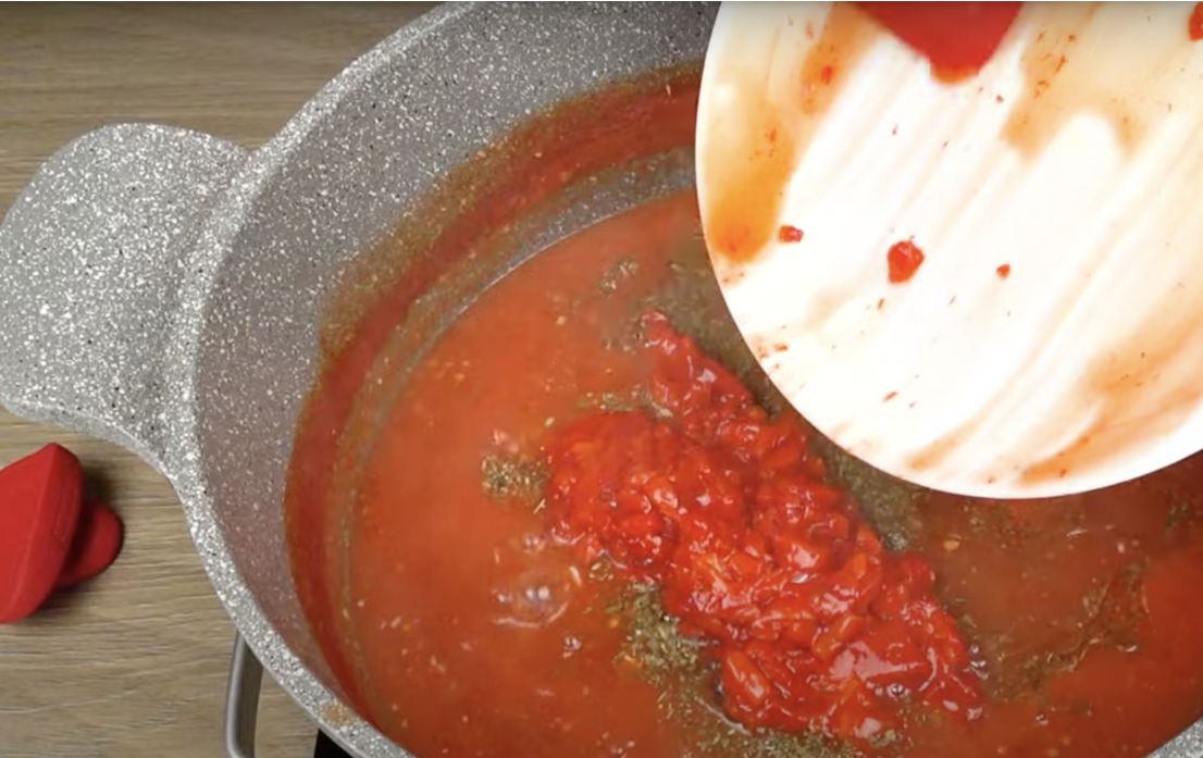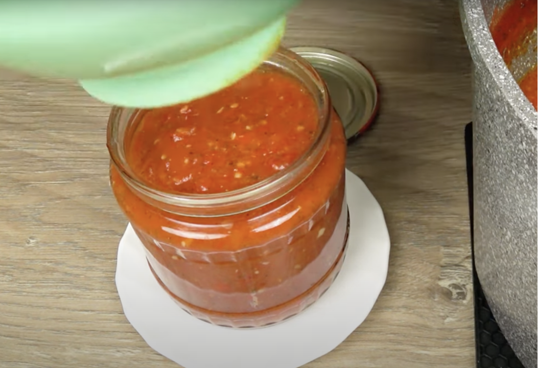 Перці очистіть від шкірки й насіння, подрібніть ножем і додайте до соусу разом із сіллю, цукром, спеціями та олією. За бажанням можна додати 1 ст. л. оцту – я не додаю, і заготовка прекрасно зберігається.