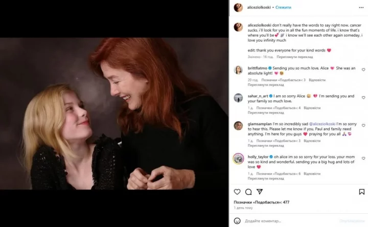 Донька акторки, Еліс, також висловила свій біль у зворушливому дописі в Instagram: