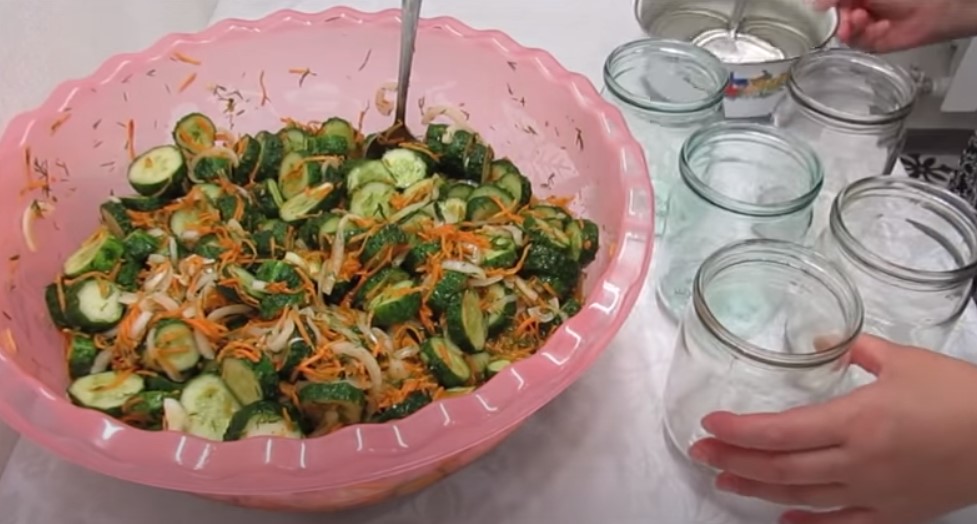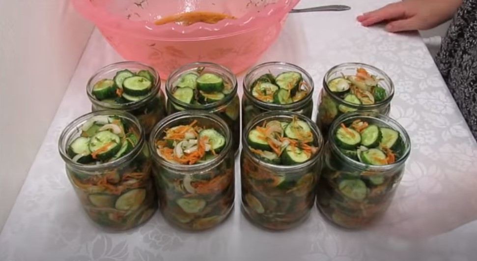 Розкладаємо салат разом із соком по стерилізованих банках.