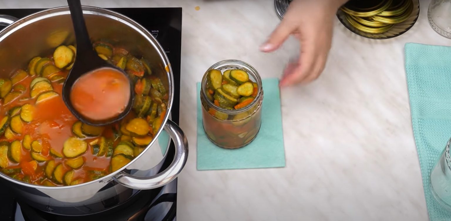 9. Розкладаємо салат у стерильні банки, заливаємо соусом, закручуємо.